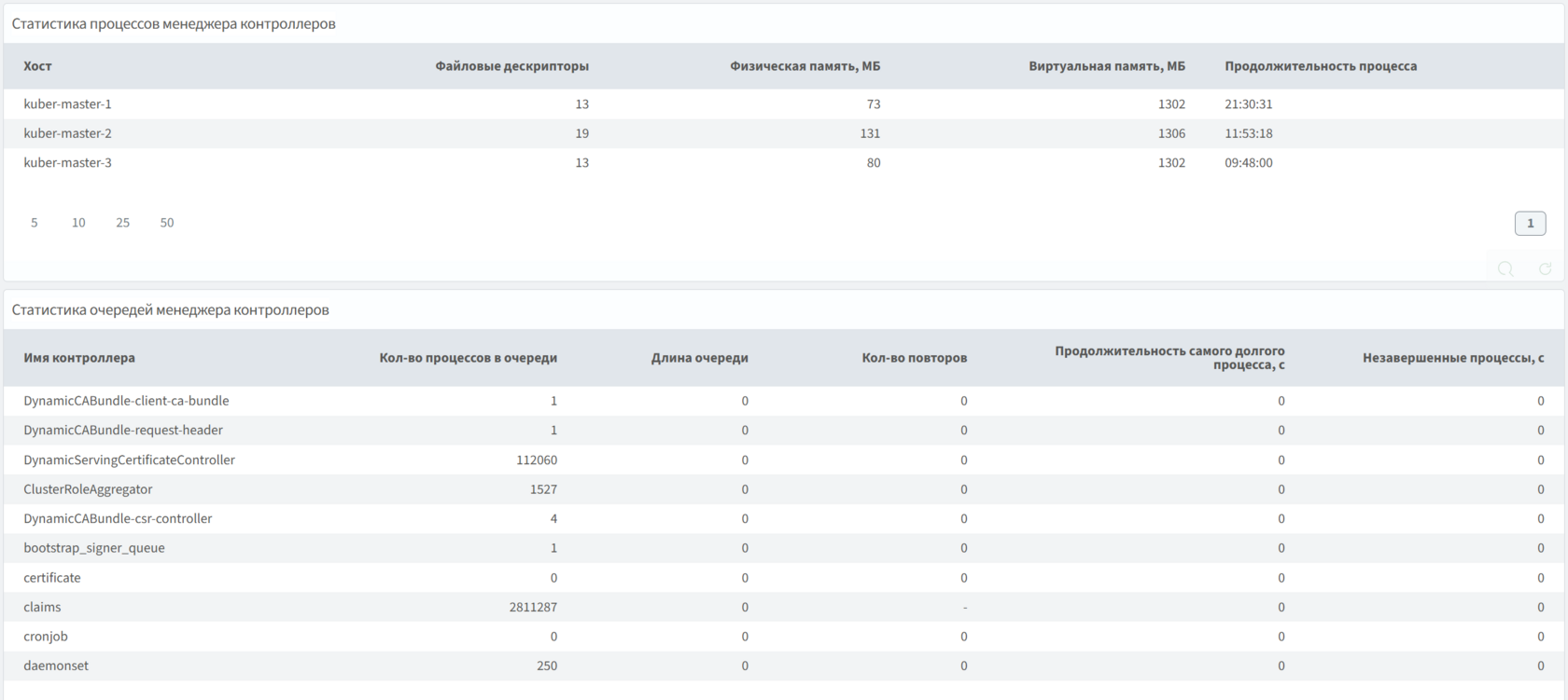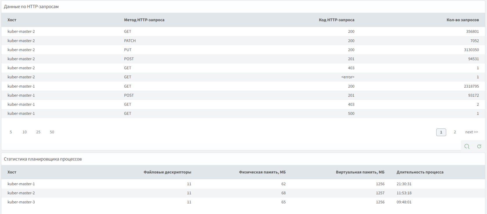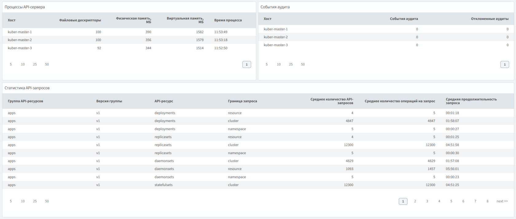 Содержит данные о компонентах Kubernetes (API-север, Прокси, Планировщик, Менеджер контроллеров), такие как нагрузка от компонента и собственных параметров, относящихся к их функционалу.