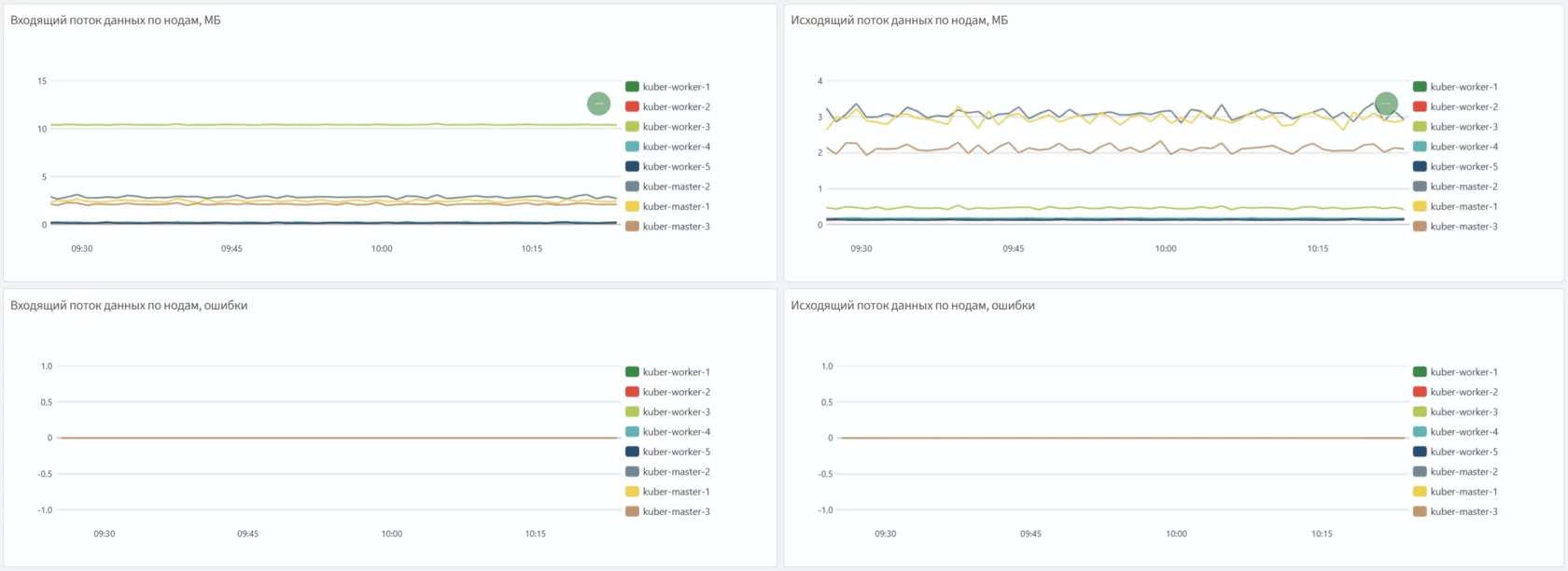 Входящий/исходящий трафик, ошибки, отброшенные пакеты.