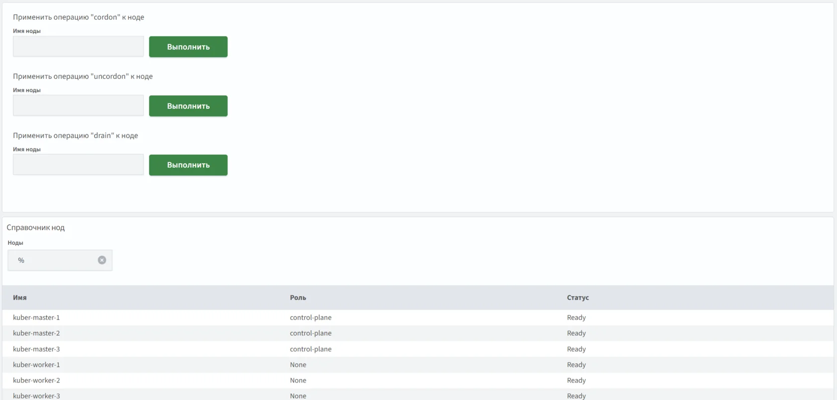 Управление статусом нод (доступность для планирования подов, удаление подов, восстановление).