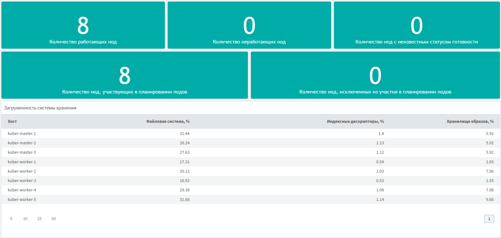 Статусы и состояния узлов кластера, а также загруженность их и системы хранения.