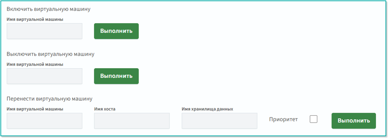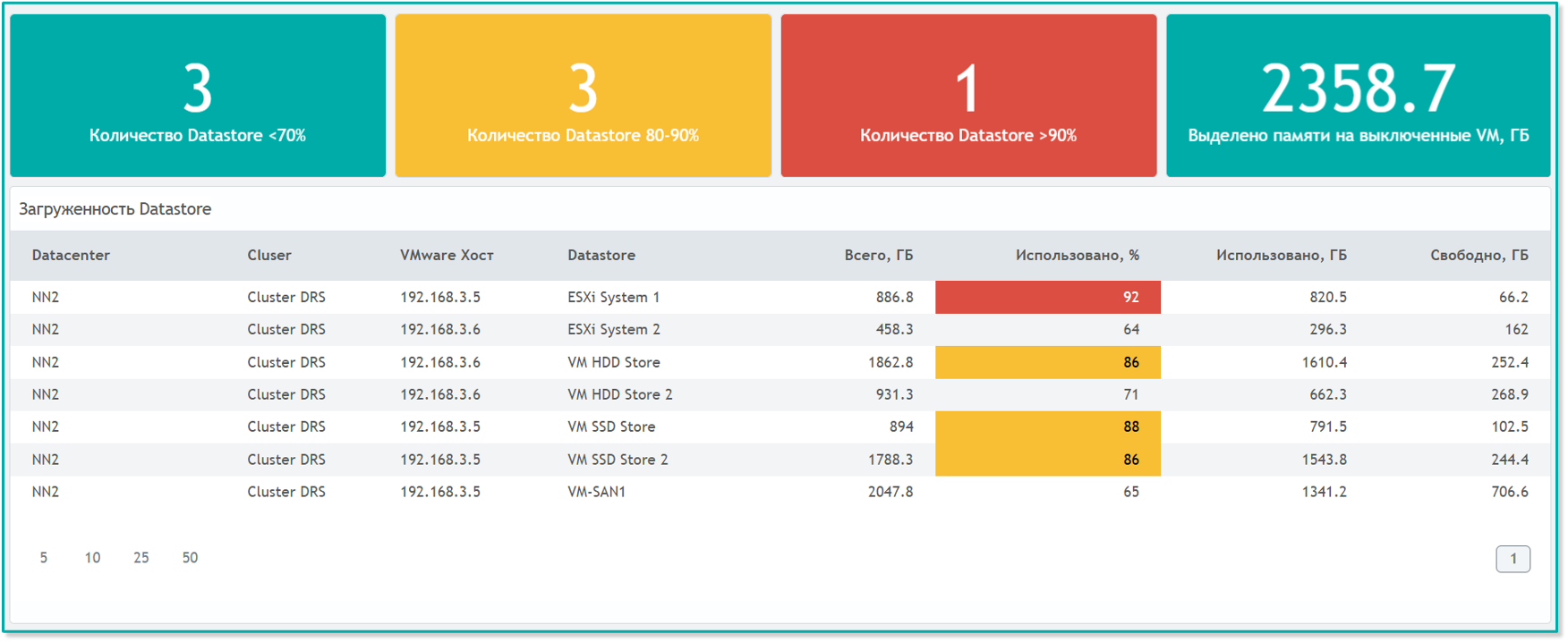 На дашбордах реализован функционал управления виртуальными машинами. Можно включать, выключать, а также переносить виртуальные машины на другой Datastore. Для удобства представлен справочник по виртуальным машинам.