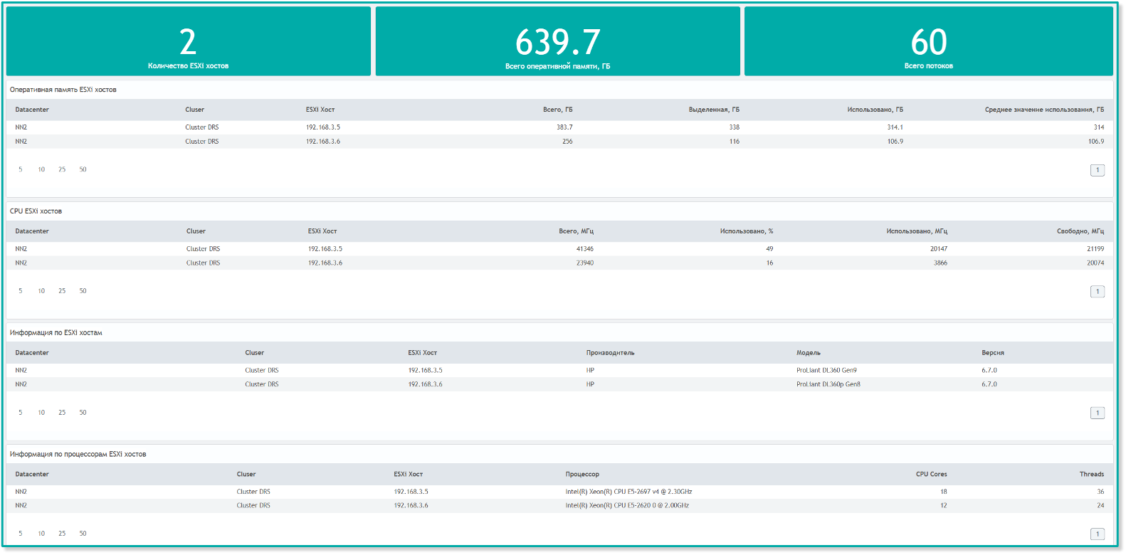 Отображает информацию о хостах с гипервизором VMware ESXi, такую как данные о имеющихся, назначенных, используемых в данный момент и средних за выбранный интервал значениях CPU и RAM, а также сетевые параметры.