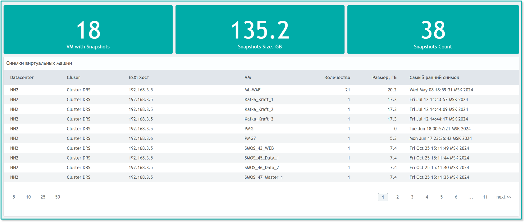 Предоставляет информацию о снимках виртуальных машин, такую как их количество, суммарный размер и временные метки.