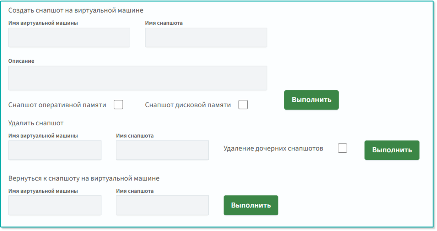 Предоставлена возможность управления снимками виртуальных машин: их создание, удаление и возврат к снимку. Справочник также реализован.