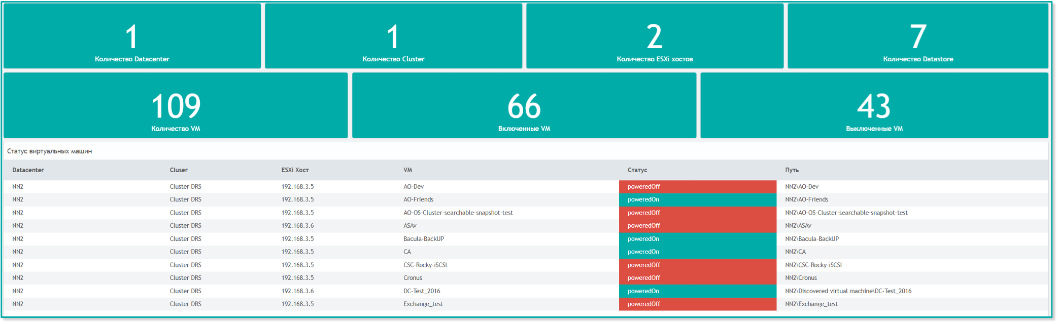 Модуль мониторинга и управления VMware от наших партнёров, Группы НН2, предоставляет комплексный контроль и инвентаризацию виртуальной инфраструктуры. Он позволяет отслеживать состояние ключевых объектов VMware, обеспечивая детальную информацию о каждом компоненте.