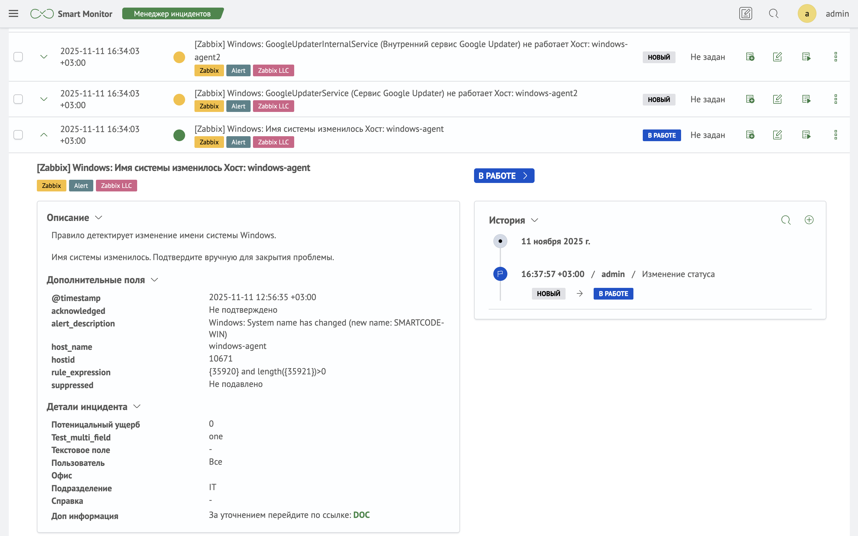 Интеграция с Менеджером инцидентов позволяет выстраивать полный жизненный цикл обработки событий, превращая триггеры Zabbix в полноценные инциденты.