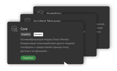 Модульная архитектура позволяет подключать нужные функции — инциденты, инвентаризацию, UEBA и др. Один модуль работает в разных сценариях, например в SIEM, ИТ-мониторинге и Compliance. Это сохраняет единый контекст и помогает быстрее находить причины сбоев и угроз.
